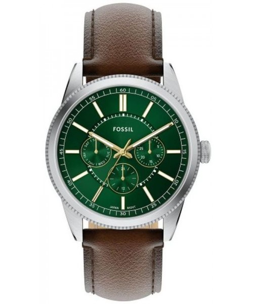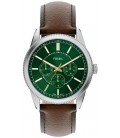 Acier Inoxydable Argenté Quartz Multifonctions Ronde 42Mm Fond Vert Bracelet Cuir De Vache Marron