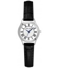 boîtier acier de 26 mm, d'un cadran argenté et blanc sur un bracelet cuir noir. Etanche