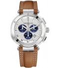 boîtier en acier, son cadran argent brossé est marqué par trois compteurs bleus évoquant les tons d