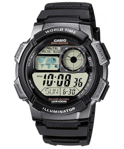 Eclairage LED, 29 fuseaux horaires, chronomètrage 1/100sec, alarme, calendrier automatique, timer.