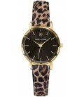 Acier Inoxydable Doré Quartz Ronde 30Mm Fond Noir Bracelet Cuir De Veau Imprimé Leopard