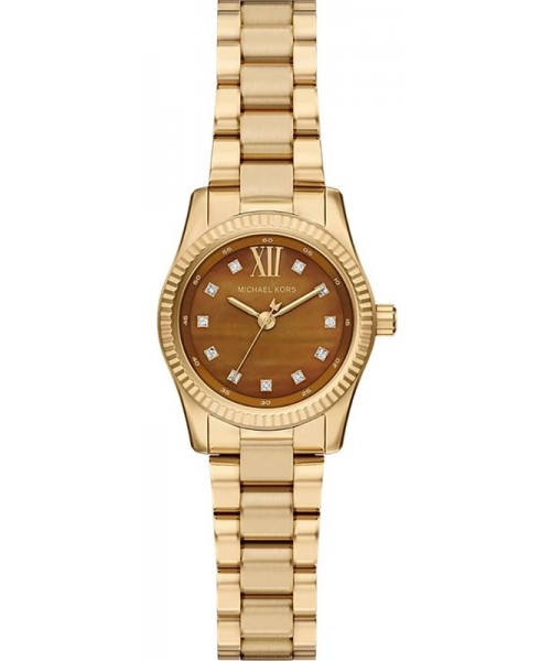 boîtier acier doré de 26mm, d'un cadran marron et d'un bracelet en acier doré. Etanchéité 50m