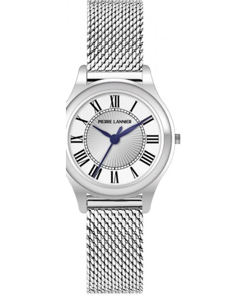 boîtier acier de 26 mm, d'un cadran argenté et blanc sur un bracelet milanais. Etanc