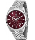 Acier Inoxydable Argenté Quartz Multifonctions Ronde 43Mm Fond Bordeaux Bracelet Acier Inoxydable