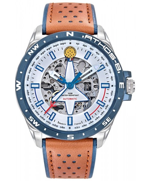 Automatique, boîtier acier 44 mm, cadran argenté, bracelet cuir marron & bleu, étanche
