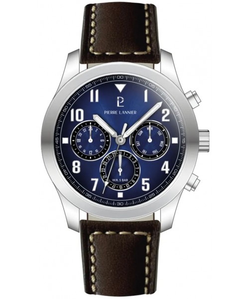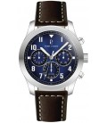 boîtier acier de 42,50 mm, d'un cadran bleu sur un bracelet cuir marron. Etanche 50