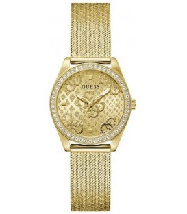 Montre GUESS référence GW0748L2.Dans la collection BOA de la marque GUESS.Acier Inoxydable Dore Ronde Quartz 32mm Fond Dore Lunette Strass Bracelet Acier Dore Milanais